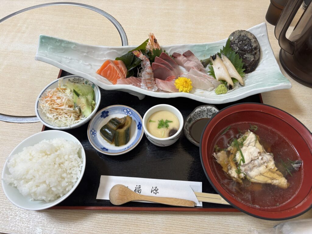空港からバスで市街地へ向かい、昼食は「割烹 福源」へ。海鮮が評判のお店で、僕らは刺身定食や海鮮丼を注文した。どれも新鮮で、昼から軽くお酒も飲んだ。気分のままに選ぶのも大人旅の楽しさだと思う。