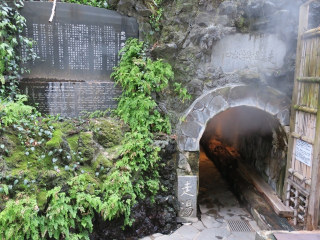 間欠泉。住宅街の石垣から温泉が吹き出している。実際に2箇所ある。